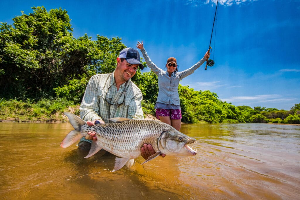 A more recent addition to the African fly-fishing map is the Faro River, in the remote savannah landscapes of northern Cameroon. The fishery is unusual in that it supports multiple tigerfish species alongside large Nile perch, creating a multi-species freshwater destination. Fishing here is conducted primarily on foot along rocky runs, pools and canyon-like sections of the river. Tigerfish are typically targeted during morning and afternoon sessions using floating or sink-tip lines paired with baitfish patterns, while heavier tackle is reserved for night fishing for Nile perch. Anglers commonly fish nine-weight outfits with short wire bite tippets and relatively heavy leaders.