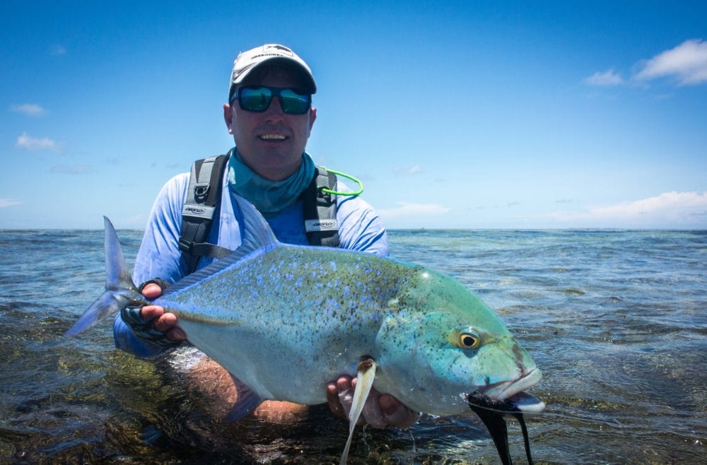 Chris built on his good form by landing another beautiful 71cm fish the next day earning him the crown of GT champion of the week. However, all the action was not limited to the flats. Tim Dykman managed to catch a Wahoo followed by a ‘Bill and Bones’ slam which he crowned with an 87cm GT in the afternoon. Tim also capped off a great week with a very respectable 70cm GT on the last day. A very impressive feat was achieved midway through the week when Chantal Chone managed to land a massive 15kg Yellow-Fin Tuna on fly whilst on a flats skiff after a grueling hour long tussle.