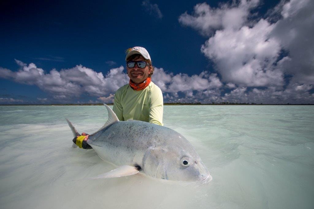To say the elements were against us this week might be considered an understatement, with winds gusting to 30 knots and 100% cloud cover at times. Be that as it may the team kept in high spirits and pushed through to record some great catches. This week was exceptionally special as this team was eager to attempt everything that Cosmo had on offer! Lake Taylor was quick off the mark and used the ‘calm before the storm’ to his advantage and landed a beautiful dorado bull. The tricky triggers were plentiful and the team managed to trick two yellowmargin and four moustache triggers into falling victim to the trusty Alphlexo crab. The GT’s were around in true Cosmo fashion with catch stats hitting the 85-mark between the team of 8 anglers. The Cosmoledo fishery is known for its larger bonefish and this week again proved this. Oleg Verber’s bonefish session is one he will never forget, managing to land 15 fish in the spectacular 8 to 9lbs range. Richard Morton, accompanied by good friend David Desilets, came out on top with the GT numbers and managed to land his second-ever moustache triggerfish. While David had never cast a fly rod before, his beginner skills excelled and he landed his first triggerfish, cracked in on the GT action and perfected his bonefishing. Ivan Kolesnichenko had a day that most of us dream of after a good morning session of bonefishing and defeating an angry GT, he managed to strike gold by landing a gorgeous gold permit of 68cm, racking up the only “Grand Slam” of the week.