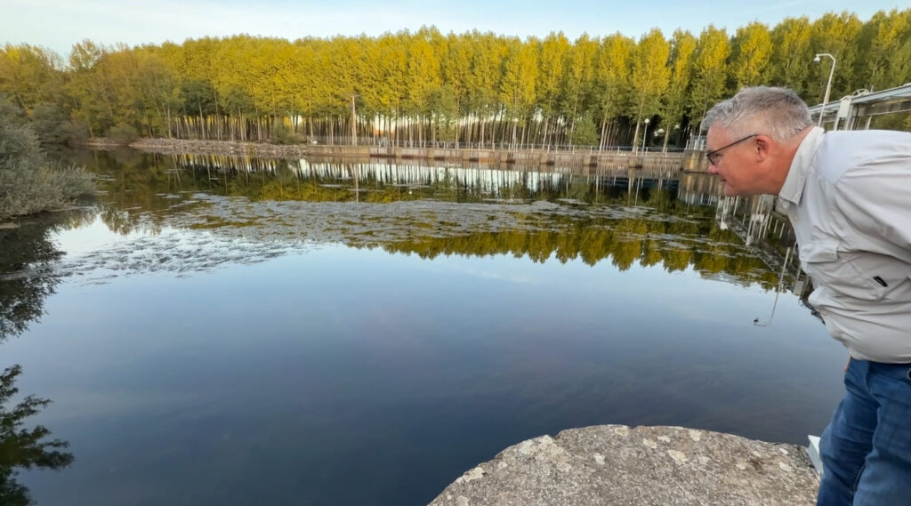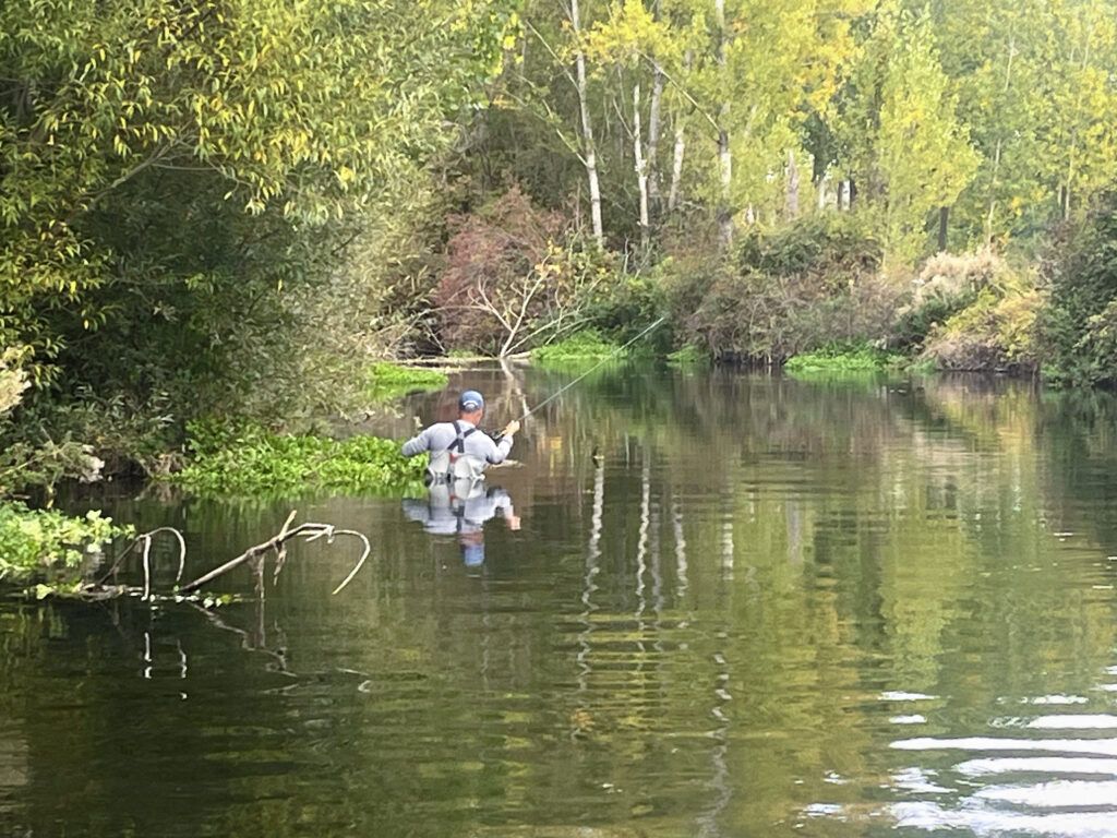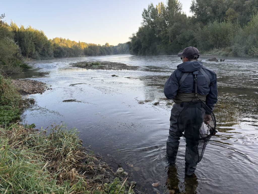 We parked near the top of the beat and climbed out to survey the water below the weir. It was an impressive sight, the Esla spilling powerfully over concrete into a deep, swirling pool. In the back-eddy directly below us, I immediately spotted one of the large trout Diego had hinted at suspended lazily in the recirculating current.