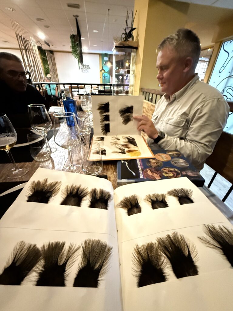 Danny, with mock seriousness, told us he knew exactly how many feathers each book contained, so we’d better not get any ideas. Laughter followed, and then he pulled out a fly box containing a wonderful collection of traditional Leonese wet flies, every pattern incorporating coq de León in some way.