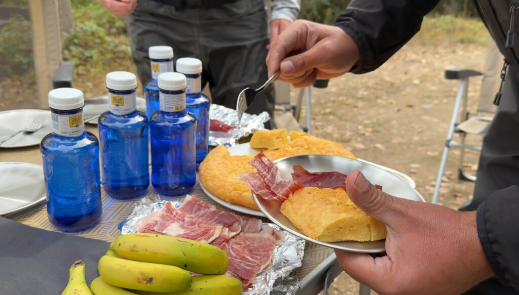 We spread out a simple but delicious riverside lunch — fresh bread, bananas, slices of smoky cecina, and generous wedges of tortilla de patatas. Few meals taste better than those eaten beside a river, especially after a morning of hard fishing. As we ate, we speculated about the quiet spell; changing pressure, cooling water, or perhaps the fish just weren’t in the mood. Whatever the reason, our hosts decided a change of scenery might do us good.