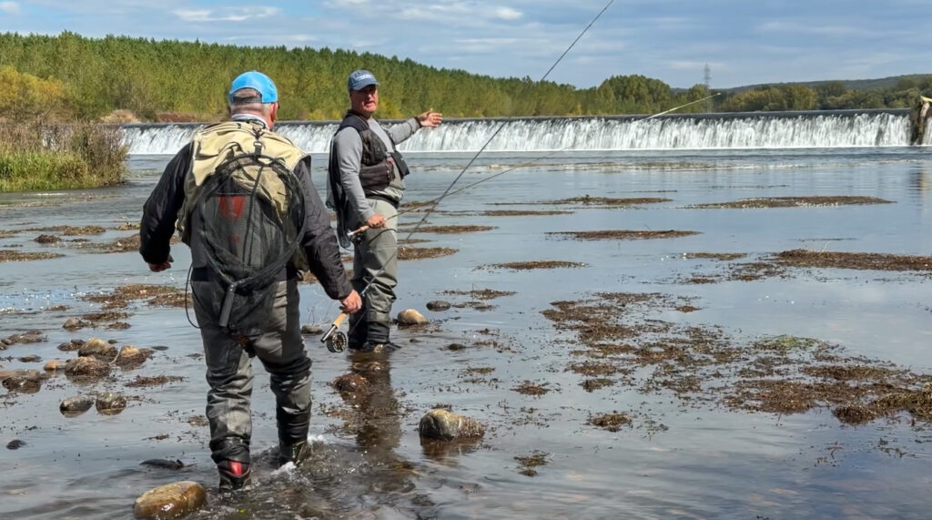 We worked our way slowly upstream, picking apart likely-looking water, but there was no sign of surface activity and no fish to hand. An hour passed in stubborn persistence. I busied myself shooting B-roll while Pete and Diego conferred quietly midstream, both frowning into the breeze.